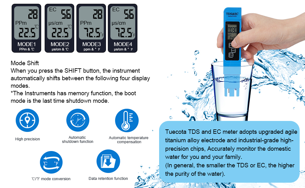 【TDS & EC Meter】: The Digital TDS & EC Tester has automatic temperature compensation function, Auto-off and Hold Function. The digital water tester shuts off automatically after 2 minutes of non-use to conserve batteries. Features a hold function that saves measurements for convenient reading and recording.