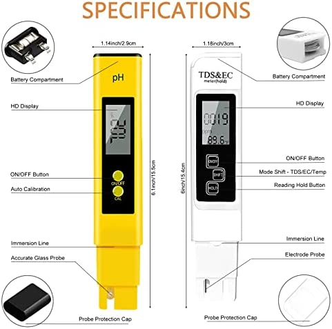 TDS/pH Meter: Both with automatic temperature compensation function, contain an accurate probe to read the test result fast, It only takes a few seconds to show accurate data on the screen. meter will automatically turn off after 5 minutes of inactive.TDS/PPM meter can tester water purity level. (Note: TDS meter can’t test seawater)