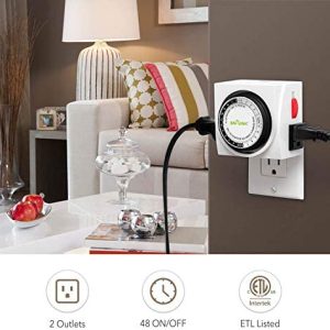 Grow1 Dual Outlet Mechanical Timer 24 Hour Hydroponics Grow Light Timers Electrical Outlets, Universal Wall Plug 3-Prong Grounded Outlet, UL Listed, 120v